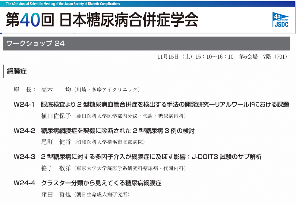 第40回日本糖尿病合併症学会より招聘を受けて座長を務めました。|登戸駅徒歩1分の眼科【川崎・多摩アイクリニック】土曜診療、日帰り手術対応|
